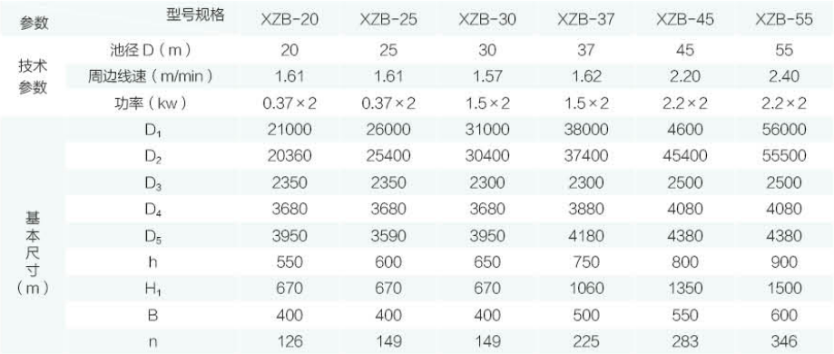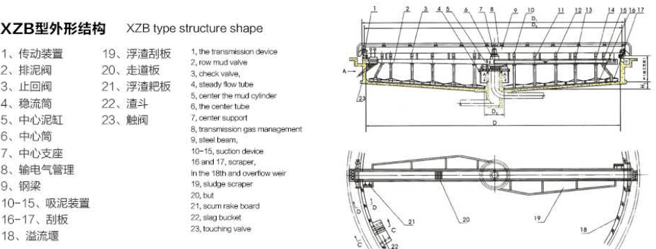 XZB型吸泥機(jī)一般用于大型(一般指流量大于500m3/h) 污水處理工程的幅流式沉淀池,特別適用于二沉池池底污 泥的刮集及外排。池形一般采用中心進(jìn)水、周邊出水、中 心排泥,池底可不設(shè)坡度(平底結(jié)構(gòu)),二沉池使用尤為廣 泛。水面浮渣、浮沫等雜物可由浮渣刮集裝置刮排至池外 渣坑或渣斗。靜壓排泥依靠各個管口閥門,調(diào)節(jié)流量流至 中心泥缸直接外排。虹吸排泥主要是利用真空泵抽真空進(jìn) 行二次虹吸提升排泥力矩變化范圍較大的場合,可采用帶力矩保護(hù)裝置的軸裝 式減速機(jī)。